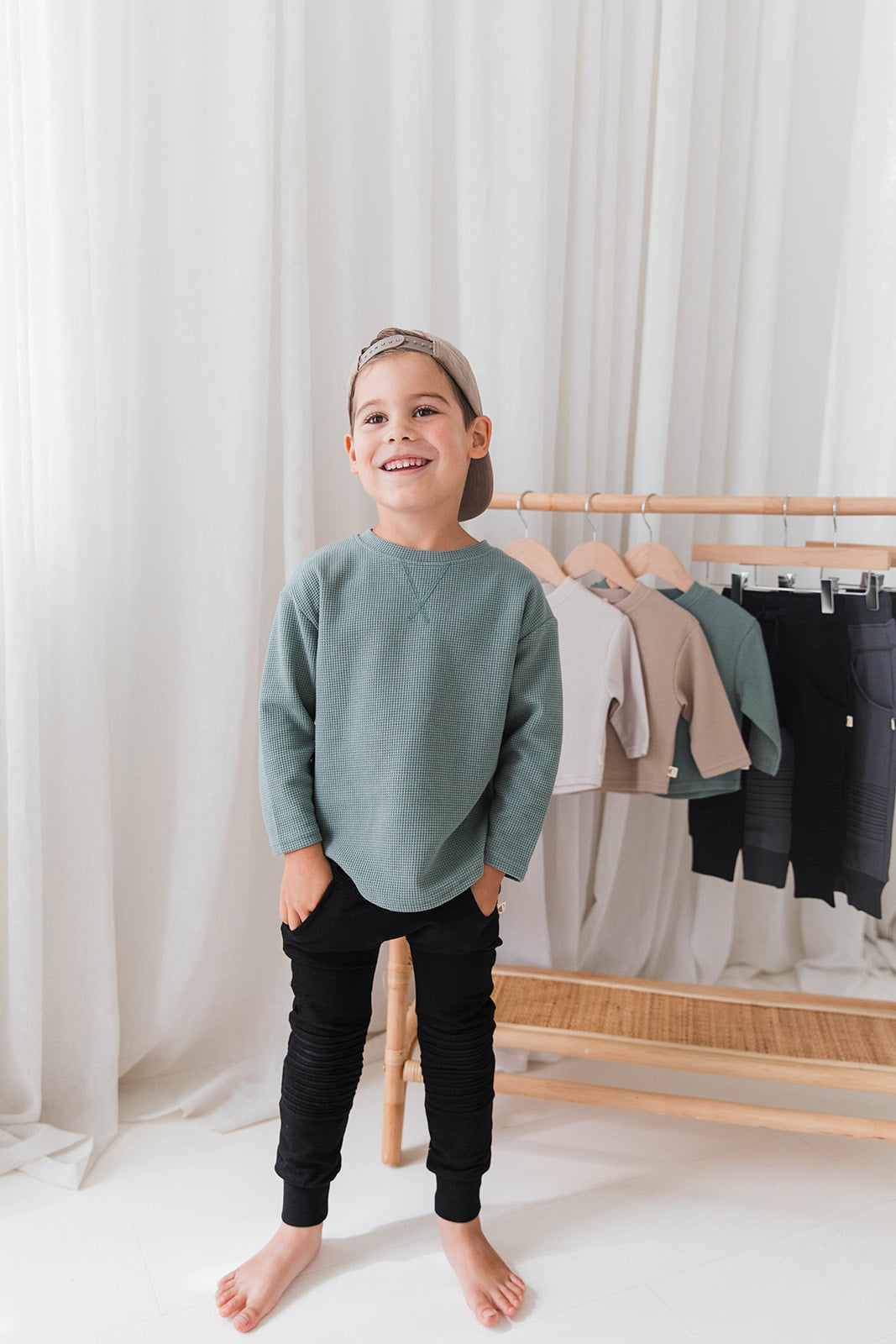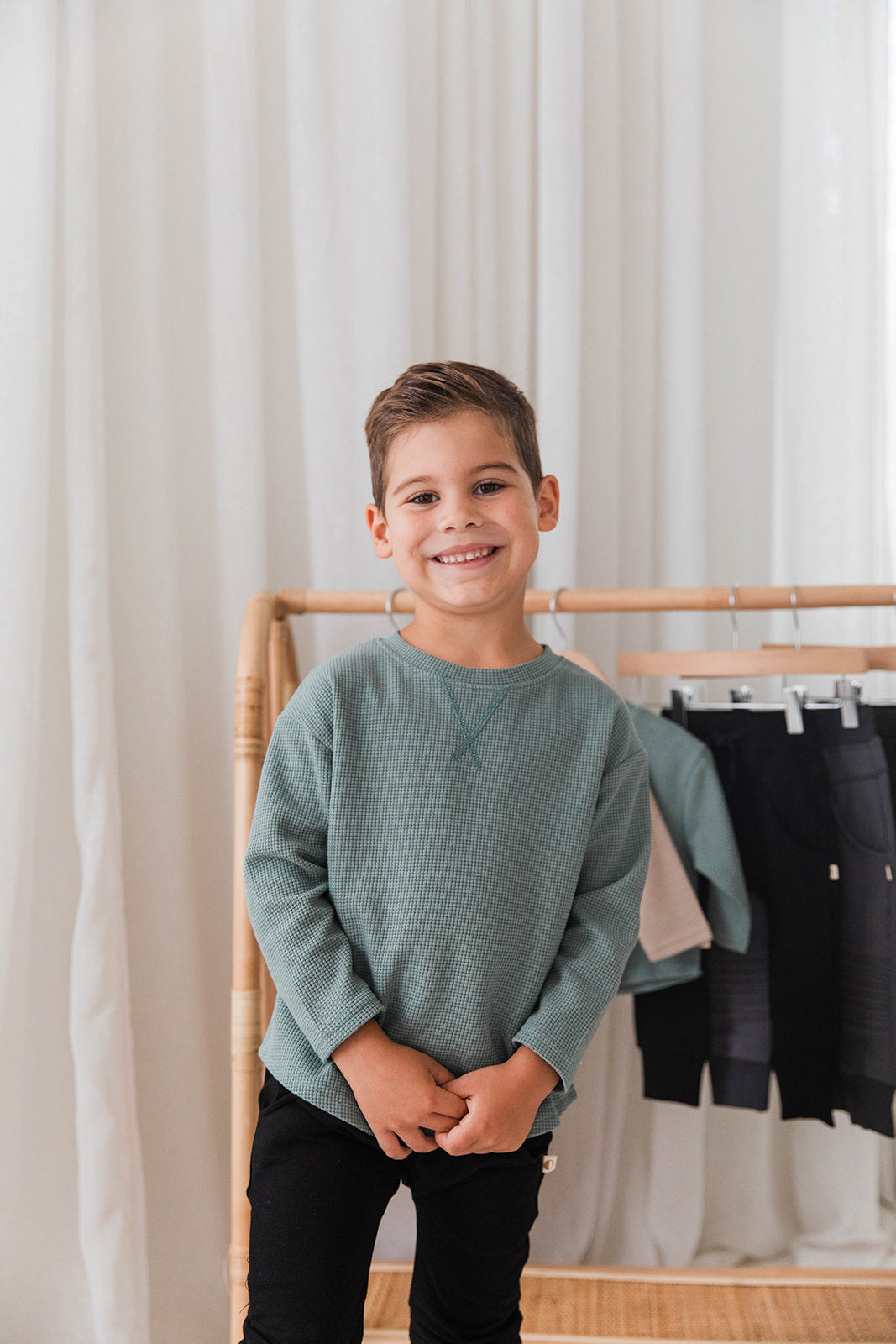 Keep your child warm and stylish with our Kids Long Sleeve Waffle Shirt. This versatile piece is perfect for layering or wearing on its own, offering cozy comfort and a classic look for any occasion.