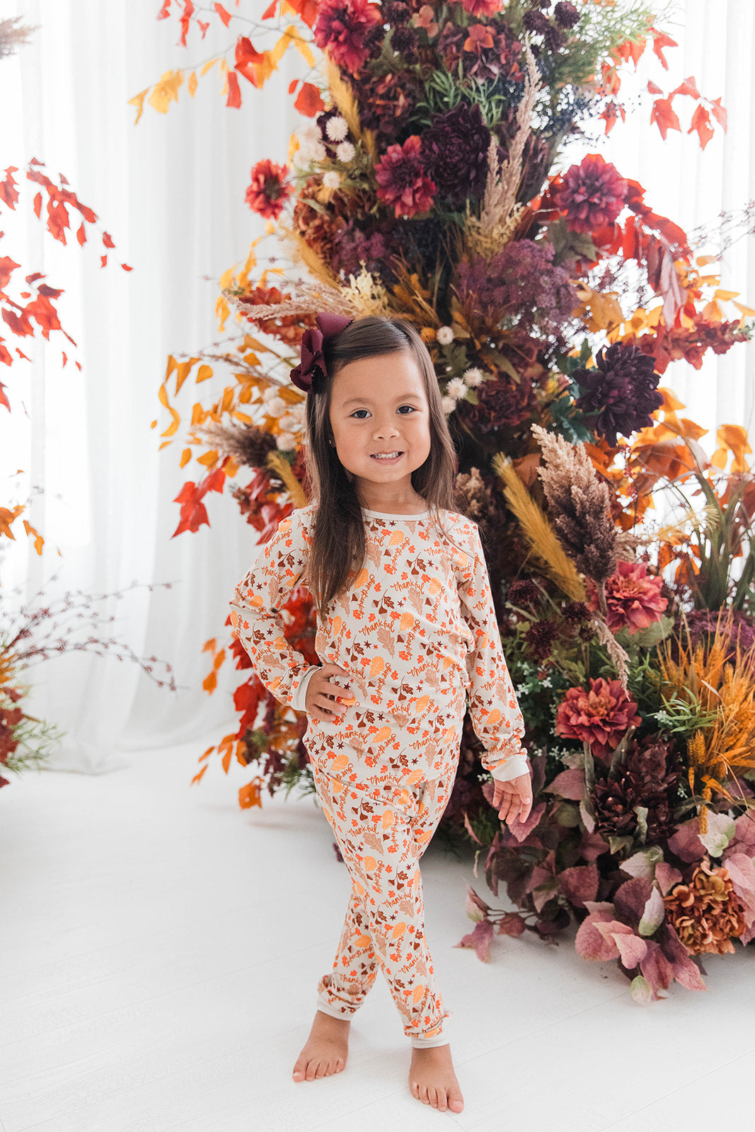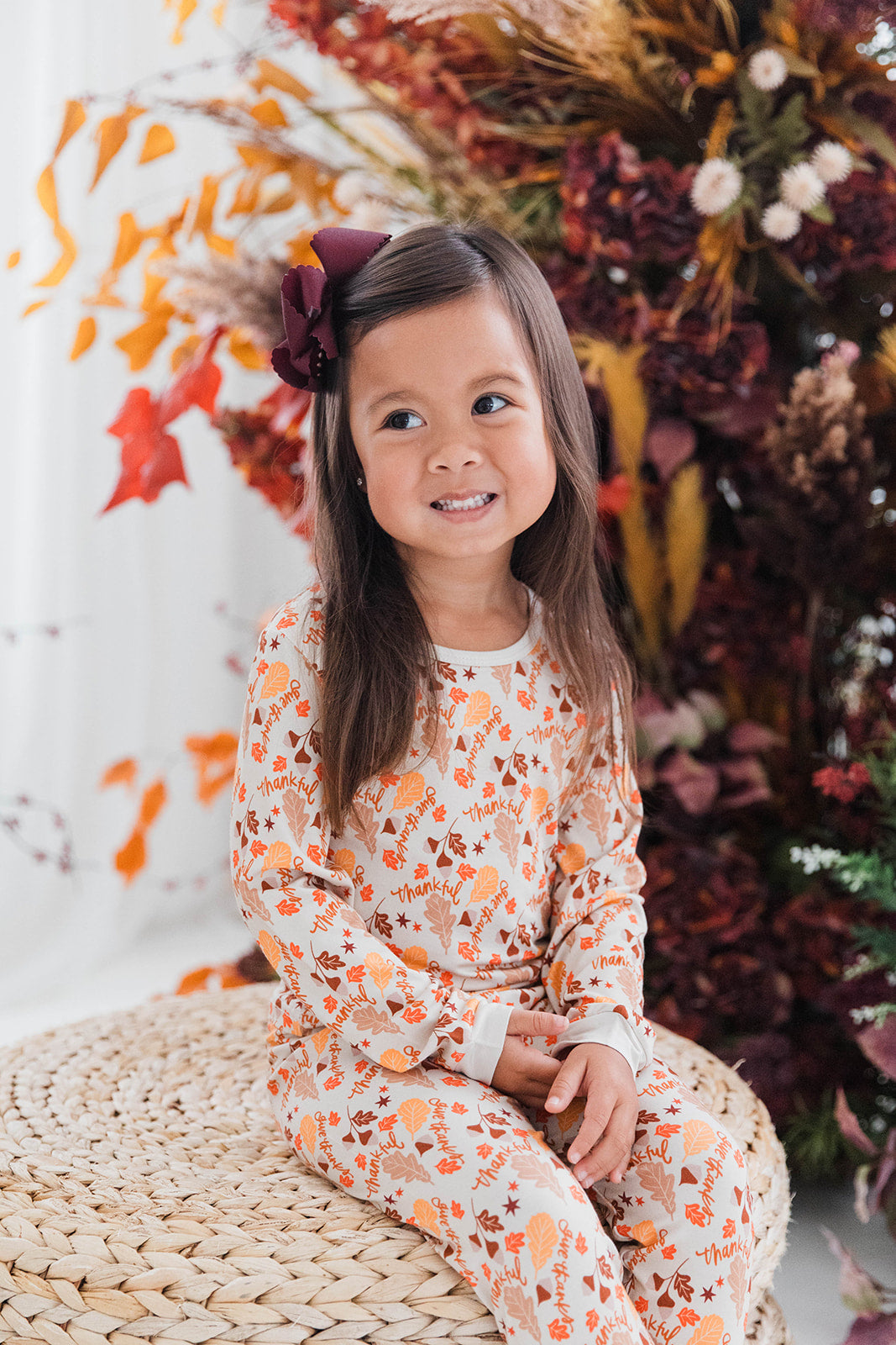 Wrap your little one in cozy fall charm with the Maple Magic Toddler Thanksgiving Loungewear Set. This festive two-piece outfit includes a buttery soft top and matching bottoms adorned with whimsical colorful autumn leaves, and harvest-inspired motifs. Crafted from breathable, durable bamboo fabric, it’s ideal for family gatherings, playtime, or relaxing at home after a big Thanksgiving feast. The easy pull-on design makes dressing stress-free for parents, while the charming seasonal print makes it a must-have for your toddler’s fall wardrobe. Celebrate Thanksgiving in comfort and style with Maple Magic!