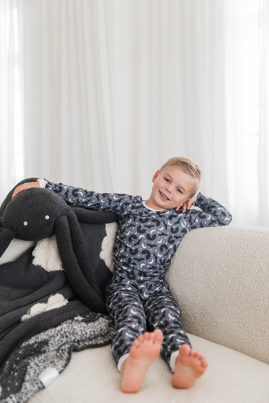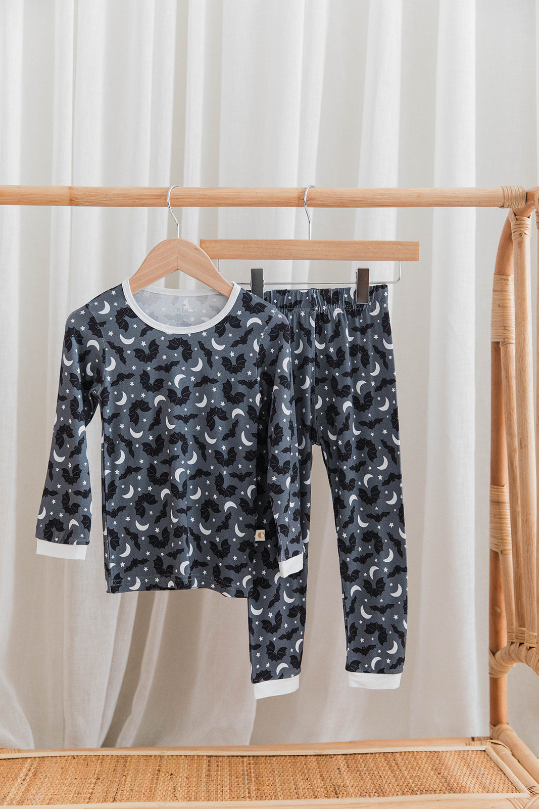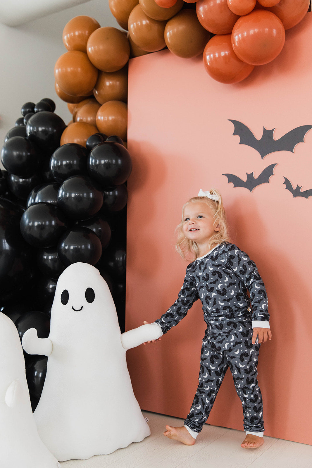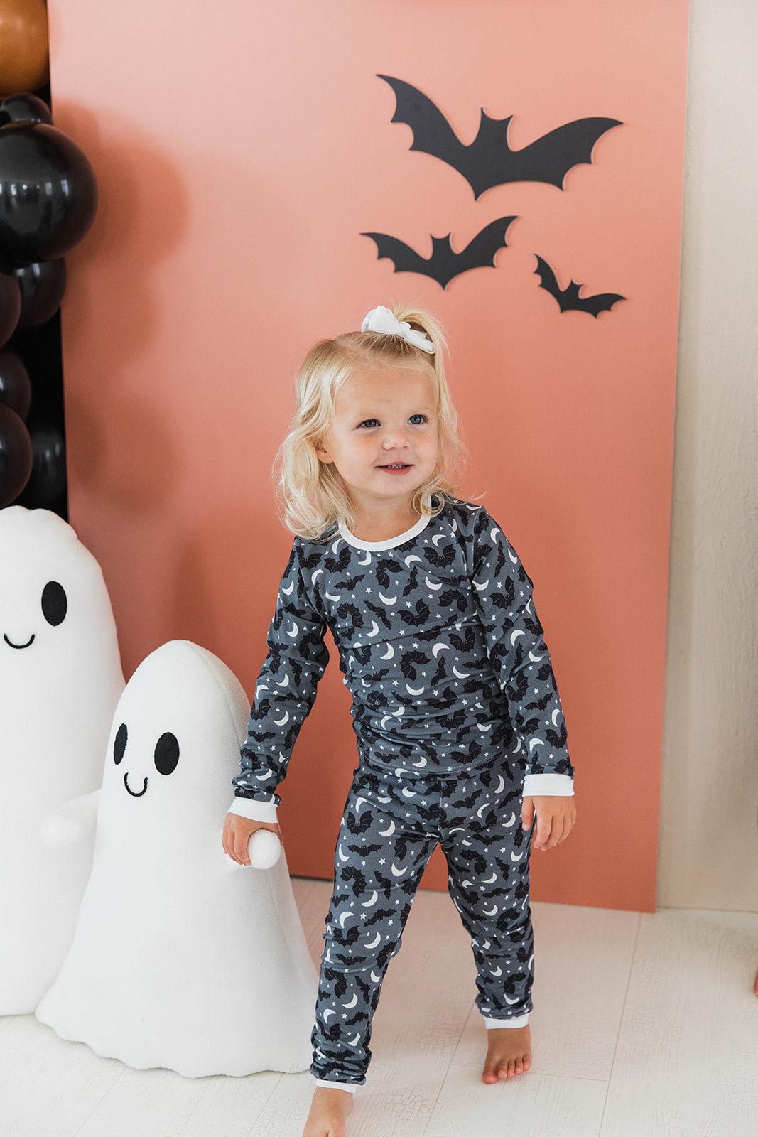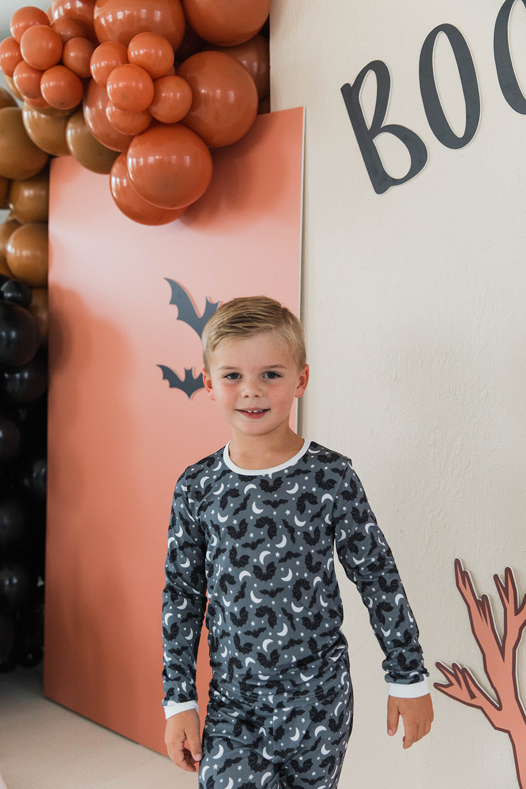 Your little one will be ready for spooky season in our toddler two-piece loungewear set featuring a Halloween bats and moons print. Made with buttery-soft, breathable bamboo fabric, this set includes a matching long-sleeve top and bottom for all-day comfort. The whimsical bats and moons design adds a festive Halloween touch, making it the perfect outfit for trick-or-treating, family photos, or lounging on crisp autumn days. Stylish, cozy, and practical, this set is a must-have for your toddler’s fall wardrobe.