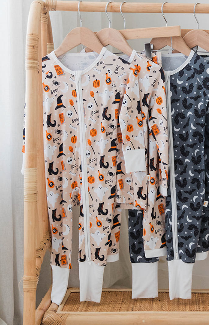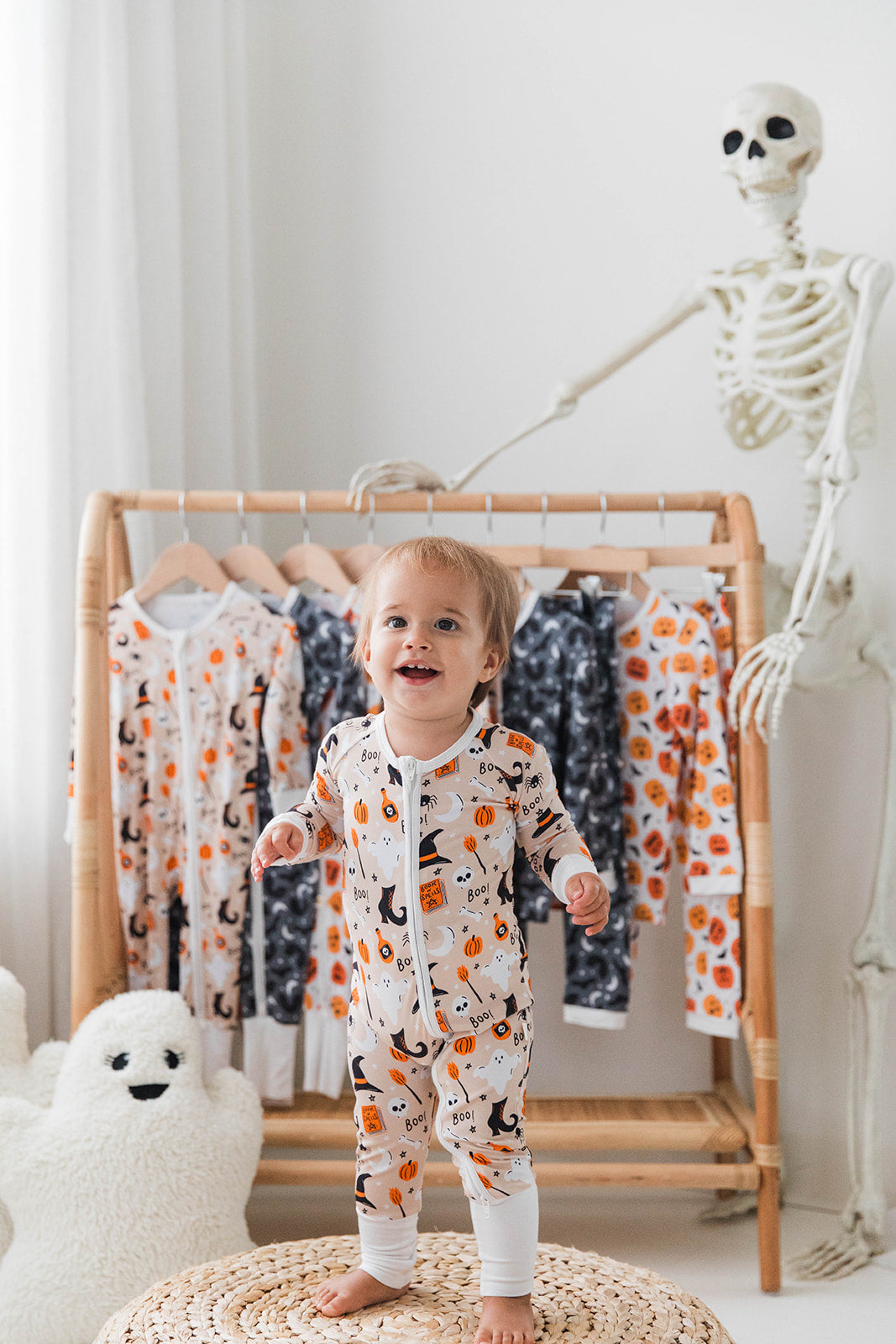 Your little one will be the cutest ghoul on the block in our zippered loungewear romper featuring a playful Halloween print with pumpkins, ghosts, skulls, and brooms. Crafted from buttery-soft, breathable bamboo fabric, this romper is designed for comfort all season long—from trick-or-treating naps to cozy fall nights at home. The practical two-way zipper makes diaper and outfit changes quick and easy, while the snug yet stretchy fit ensures safe sleep and play. With its festive all-over Halloween design, this romper is a must-have for spooky season.