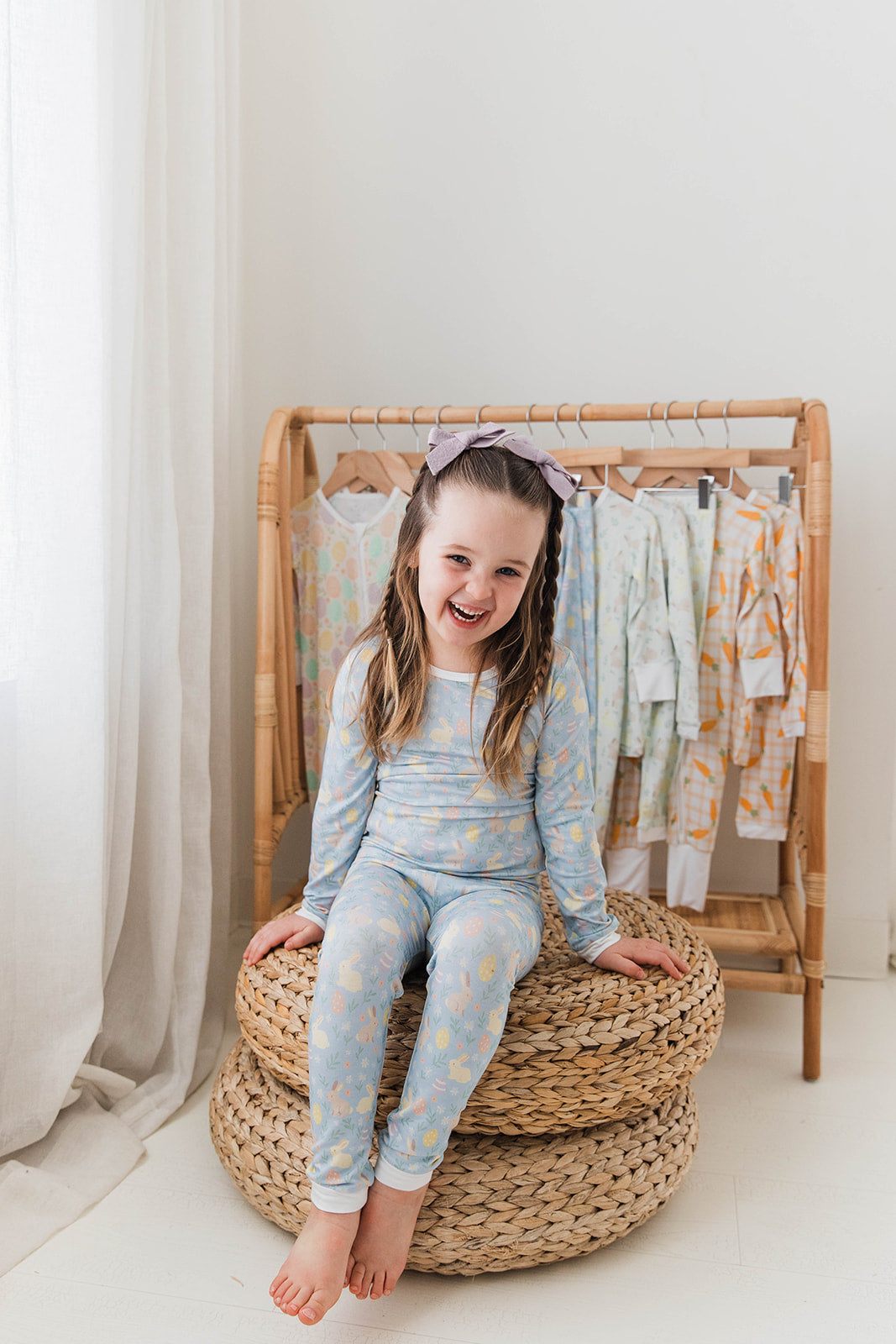 Make springtime lounging extra sweet with our Bunny Blossom Loungewear Set. Featuring an adorable allover print of playful rabbits and colorful Easter eggs, this festive set is perfect for Easter morning, egg hunts, and everyday comfort. Crafted from soft, breathable bamboo fabric, the matching top and bottoms offer a cozy fit while allowing easy movement for play, rest, and sleep. Designed for comfort and cuteness, this two-piece set is a seasonal must-have for Easter celebrations and spring snuggles.