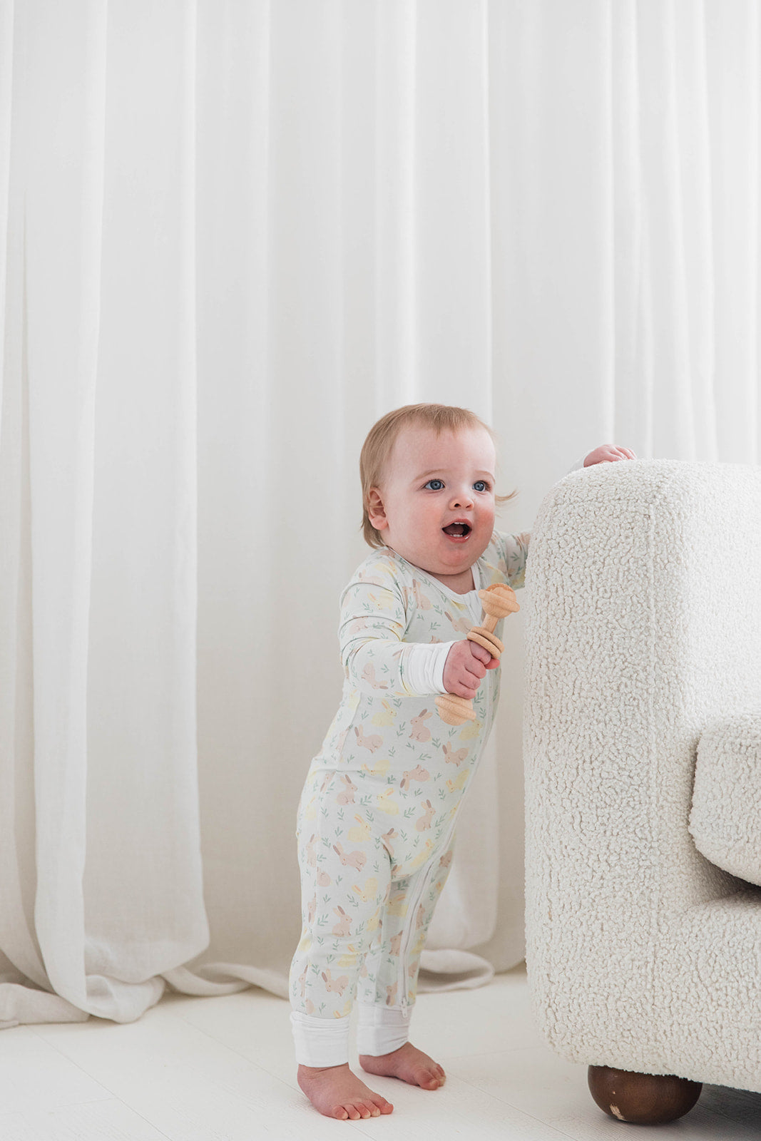 Bring a calm, spring-inspired look to Easter lounging with our Sage Bunny Trail Zippered Romper. Designed in a soft sage green with an adorable bunny theme, this cozy one-piece is perfect for Easter morning, springtime cuddles, and everyday wear. Made from buttery-soft, breathable bamboo fabric, it keeps little ones comfortable while allowing easy movement for play and rest. The full-length double zipper ensures quick and stress-free changes, making it a favorite for parents and caregivers. A timeless and soothing Easter essential for spring celebrations and seasonal photos.