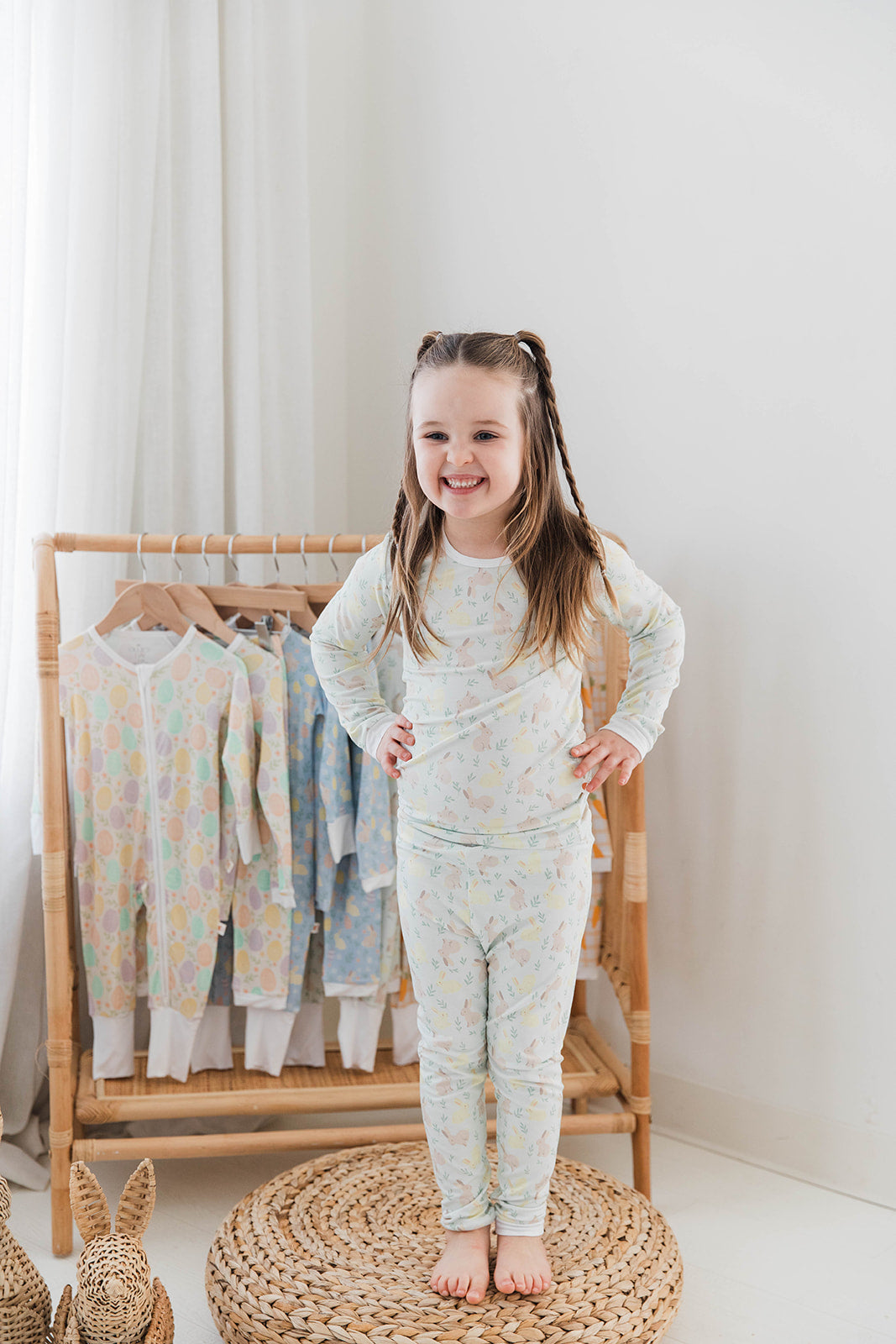 Create a calm and cozy Easter look with our Sage Bunny Trail Two-Piece Loungewear Set. Designed in a soft sage green with an adorable bunny theme, this matching top and bottom set is perfect for Easter morning, spring lounging, and everyday wear. Made from ultra-soft, breathable bamboo fabric, it offers all-day comfort while allowing little ones to move freely during playtime or rest. Thoughtfully designed for both style and comfort, this two-piece set is a timeless spring staple for Easter celebrations and seasonal photos.